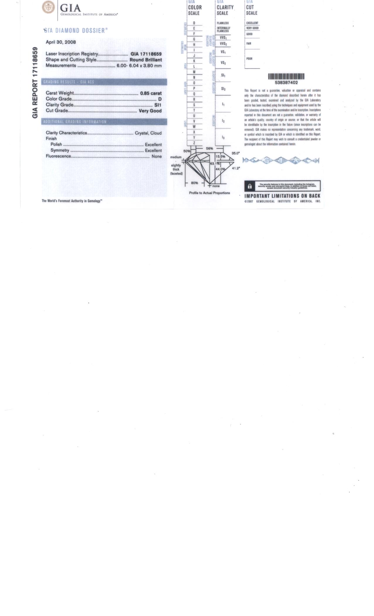 GIA 0。85 D SI1 VG EX EX N $25200