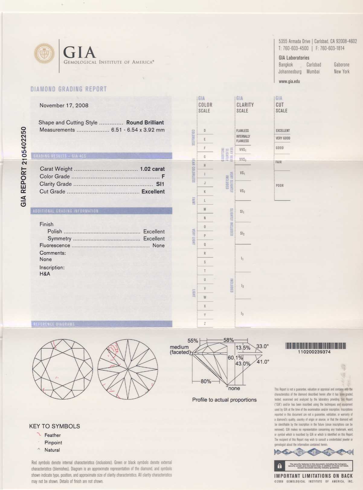 GIA        2105402250        1.020        F        SI1        Ex.        Ex.        Ex.        None        Y        圓形        MED - MED        - -