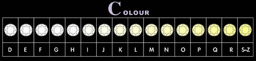 鑽石的顏色分級,由英文字母的 D (透明無色) 到 Z (淺黃色) 共分 23 級。檢視鑽石的色澤以未鑲嵌的裸石才能清楚鑑定,因鑽石是透明物質,會因為週遭環境光線顏色而影響其本身色澤,所以0.3克拉以上的鑽石,千萬不要購買已鑲嵌好的,因為無法標準的檢視其顏色與淨度的等級。